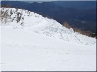 なお登っていく右手の斜面には大きな雪の固まりがごろごろしていました(この状態ではこの斜面は滑ることは難しそうです)。どうも上から落とされたような感じですが、原因はこの上を通っている道路の除雪作業でした。