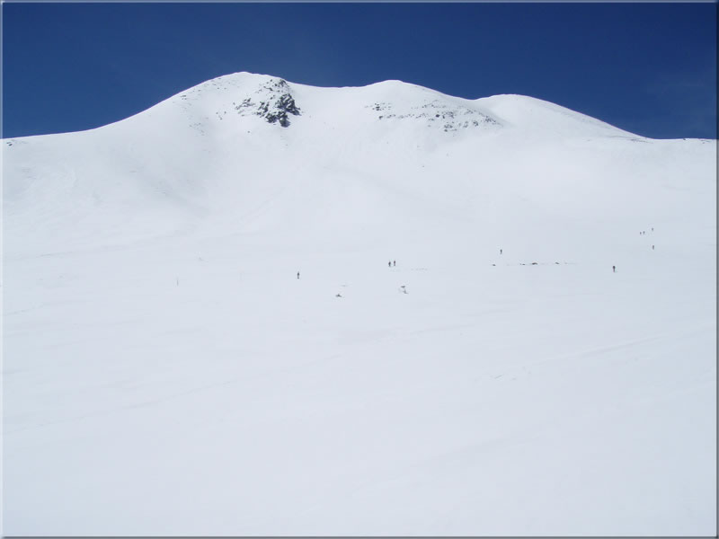 乗鞍岳の山頂から滑っている人が何人も見えます。次の写真2枚は乗鞍岳をズームして撮影したもの。