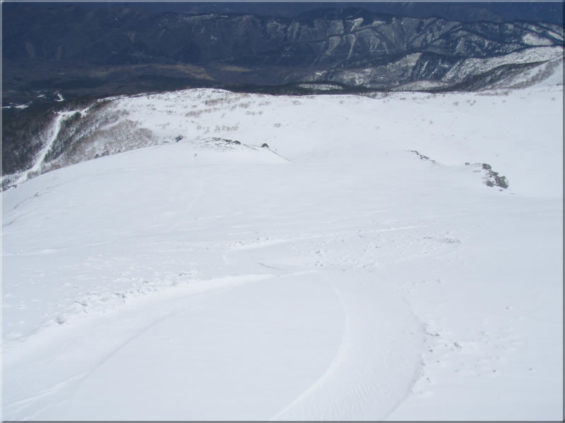 次の写真は下る斜面の上から下を見たもの。めちゃくちゃ急でもなく緩斜面でもない、適度な斜度の斜面が続いています。既に数人が滑った跡がありますので、出来るだけそこを避けて滑ってみました。