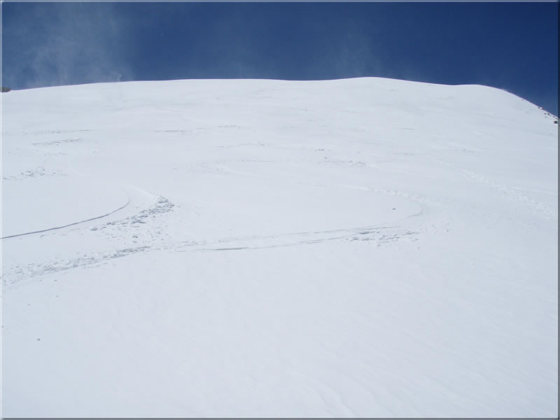 次の写真は今日滑った斜面をズームで撮影したもの。中央上の斜面ピークから右下に向かって滑り降りてきたことになります。重めながら新雪の感触を味わうことが出来、滑っていて気持ちよかったです(^^)。