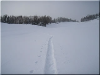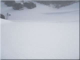 上の写真の今滑ったシュプールのすぐ右側に見えるかすかなシュプールは私の1本目です。もうほとんど消えかかっています。いかに今日が風が強くかつ雪がさらさらか、よく分かります。