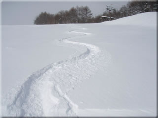 斜度が急になるとスキーのトップが雪面の上に出て気持ちよくパウダーを滑ることが出来るようになります。さらさらで底付き無し、文句なしのパウダーです(^^)。そんなノートラックバーンを滑ることが出来るのは至福のひとときでした。