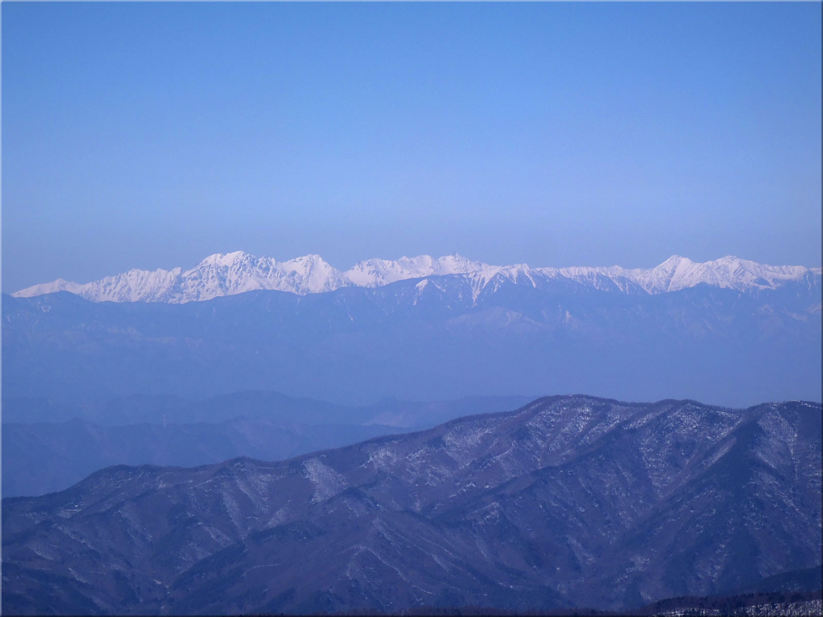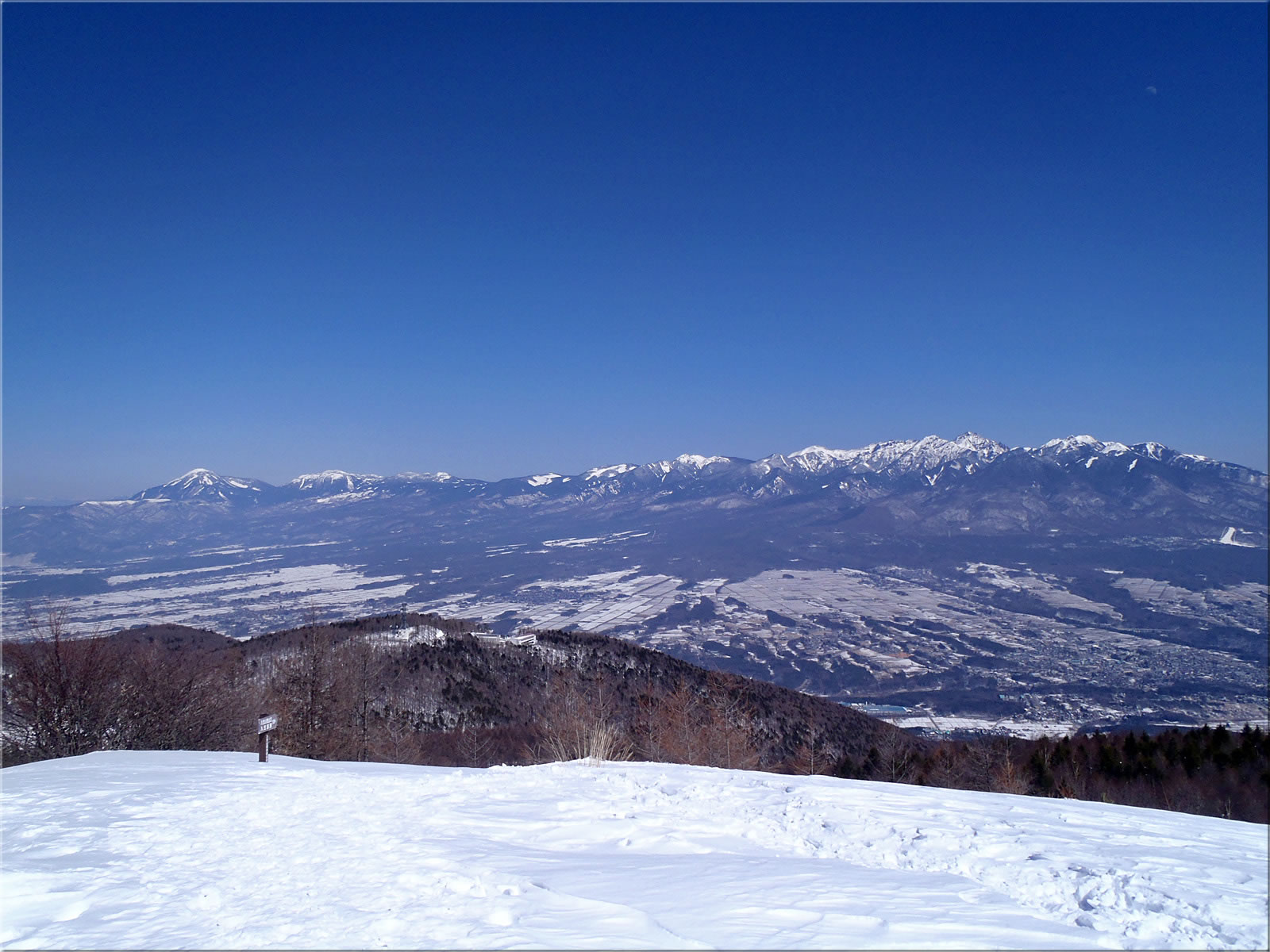 風も弱く、日射しが強いのでそれほど寒くはありません。それにしても雲一つ無い素晴らしい天気です(^^)。では今日の大展望を八ヶ岳方面から左回りでご紹介。