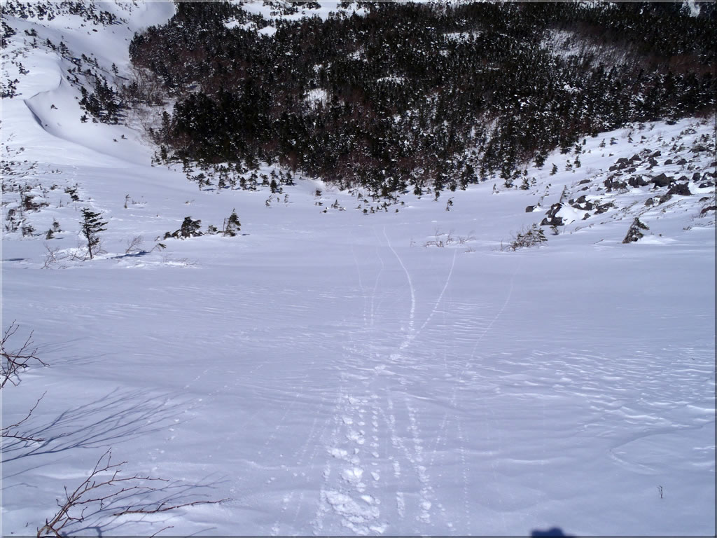 根石岳との間の斜面の様子。ここは風の通り道かつ南側斜面ということで、それほど雪は多くありません。西天狗側からまるで滑り台のように雪が吹きだまっている斜面がありますが、ただ日射の影響で雪の状態はあまりよく無さそうです。