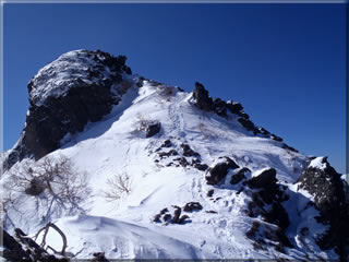 樹林帯を抜けたところの急斜面を登り切ると、いきなり目の前に天狗岳がどーんと見えてきます。素晴らしい景色、そして素晴らしい天気で言うことがありません(^^)。ここまではほぼ無風でしたが、この辺りからは少し冷たい風を感じるようになりました。やはりまだ冬山ですから。