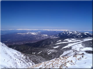 登山としては夏冬関わらず何度も来ている山ですが、スキーでのバックカントリーとしては初めてとなります。ネットで調べてみたら、東天狗と西天狗の間の稜線を北側に滑降した記録や、東天狗側の天狗の奥庭に下るあたりの斜面を滑降した記録が見つかり、ぜひ一度どんなものか出かけてみたいと思っていたので、今回念願が叶いました。それにしても長野県内全部が見通せる素晴らしい快晴、そして昨日の降雪のあと強風が吹き荒れなかった事によるディープパウダーと滑りも素晴らしいものでした。これほど良い条件のバックカントリーはそうそう無いかも。ただ...、西天狗岳からの急斜面の滑降では、隣の斜面でいつの間にか雪崩が起きていてびっくりしました。