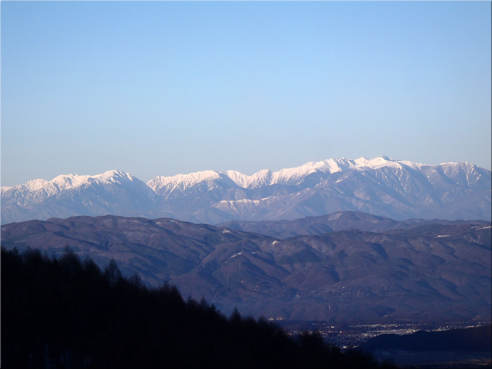 南アルプスをズーム。左より北岳、甲斐駒、仙丈ヶ岳。