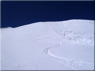 シュカブラ帯を抜けて斜面がまっさらになると、その先は日射の影響で軽くクラスト気味の斜面となりました。