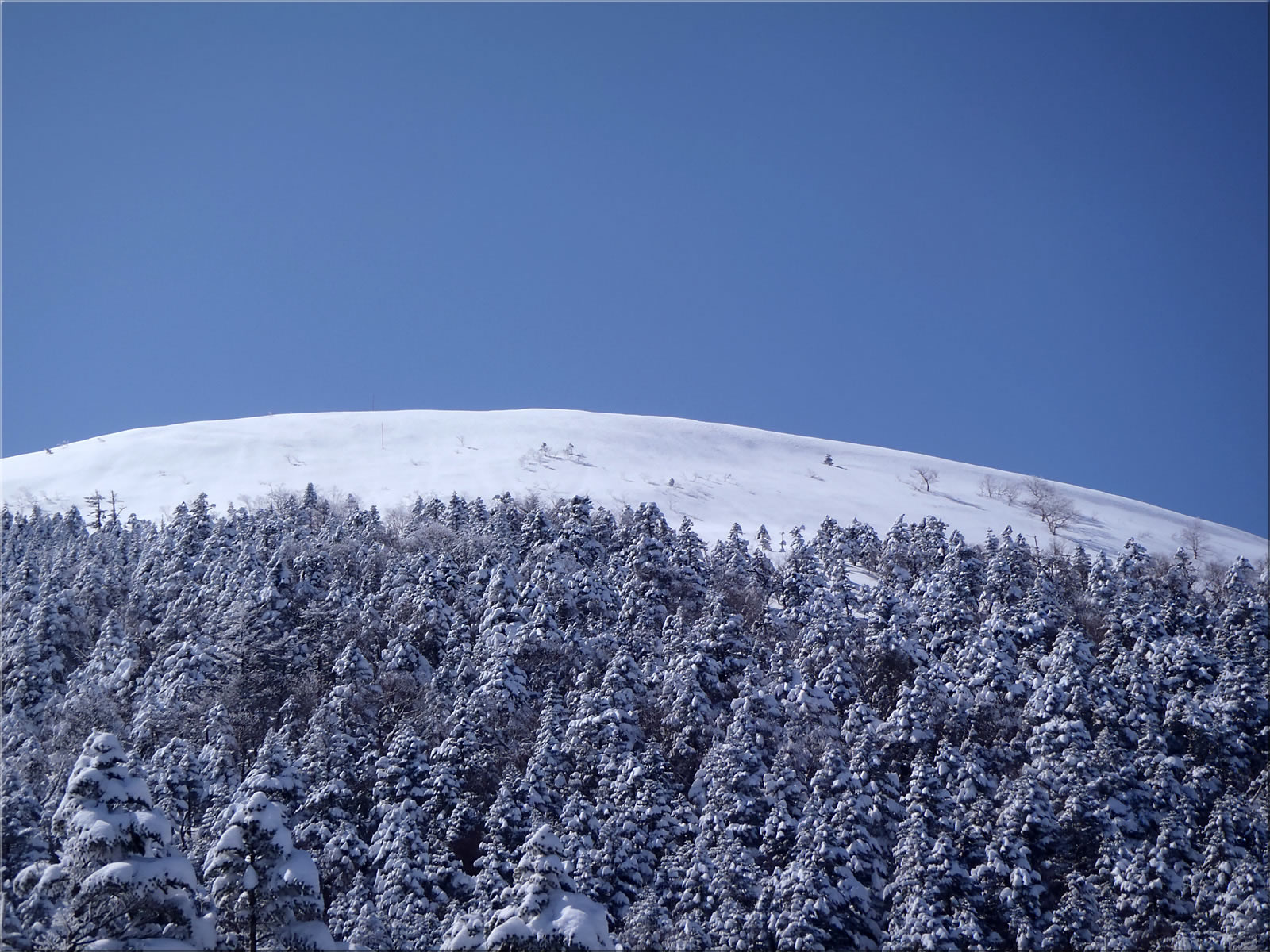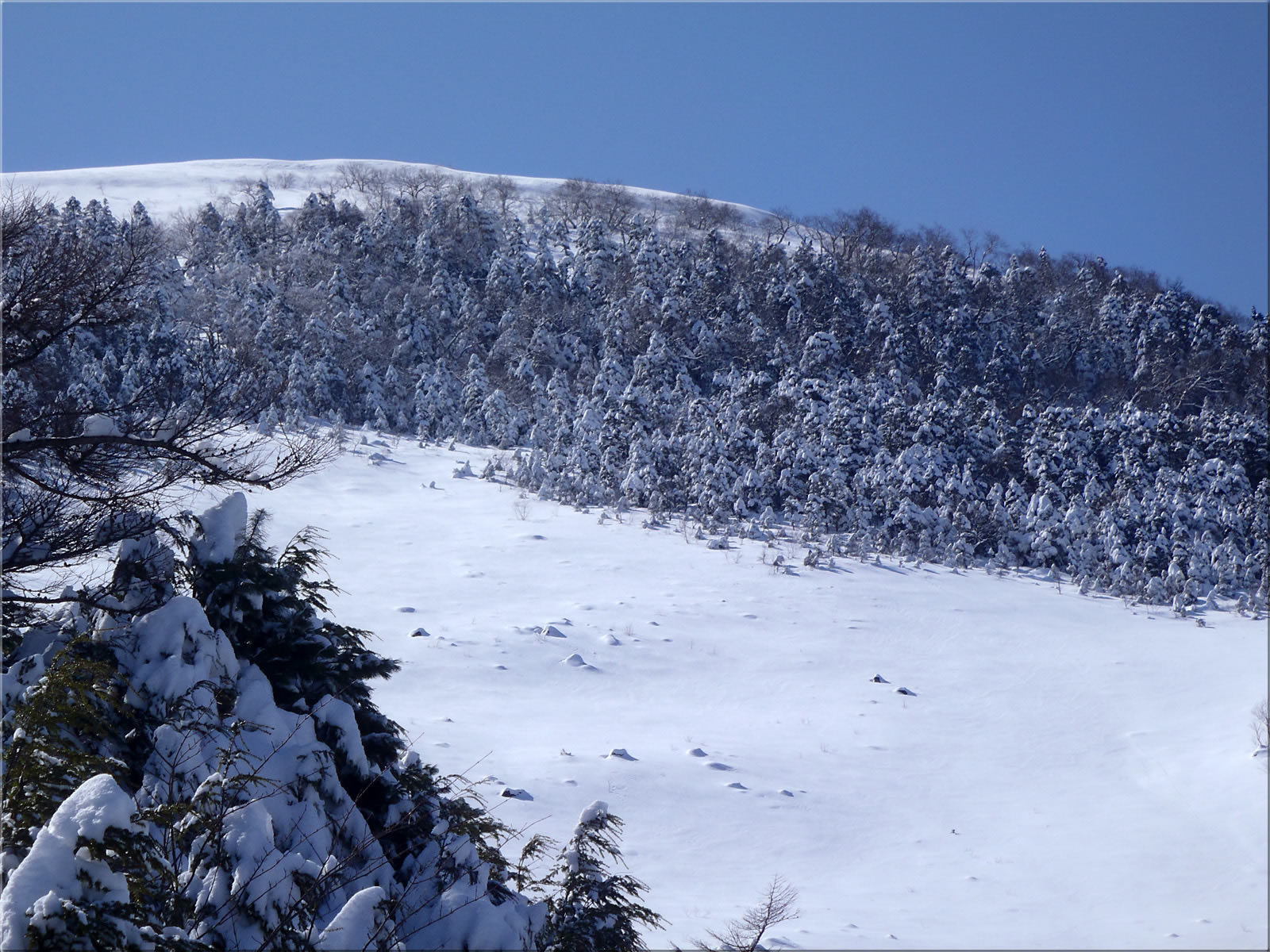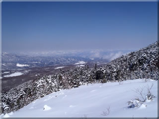 ここからの展望。雲も取れ、気持ちよい青空が広がりました。うっすらと北アルプスも見えています。今日は間違いなく山頂からも最高の展望を楽しめると確信していたのですが、ラッセルで時間がかかり、その間にガスがかかってしまいました。