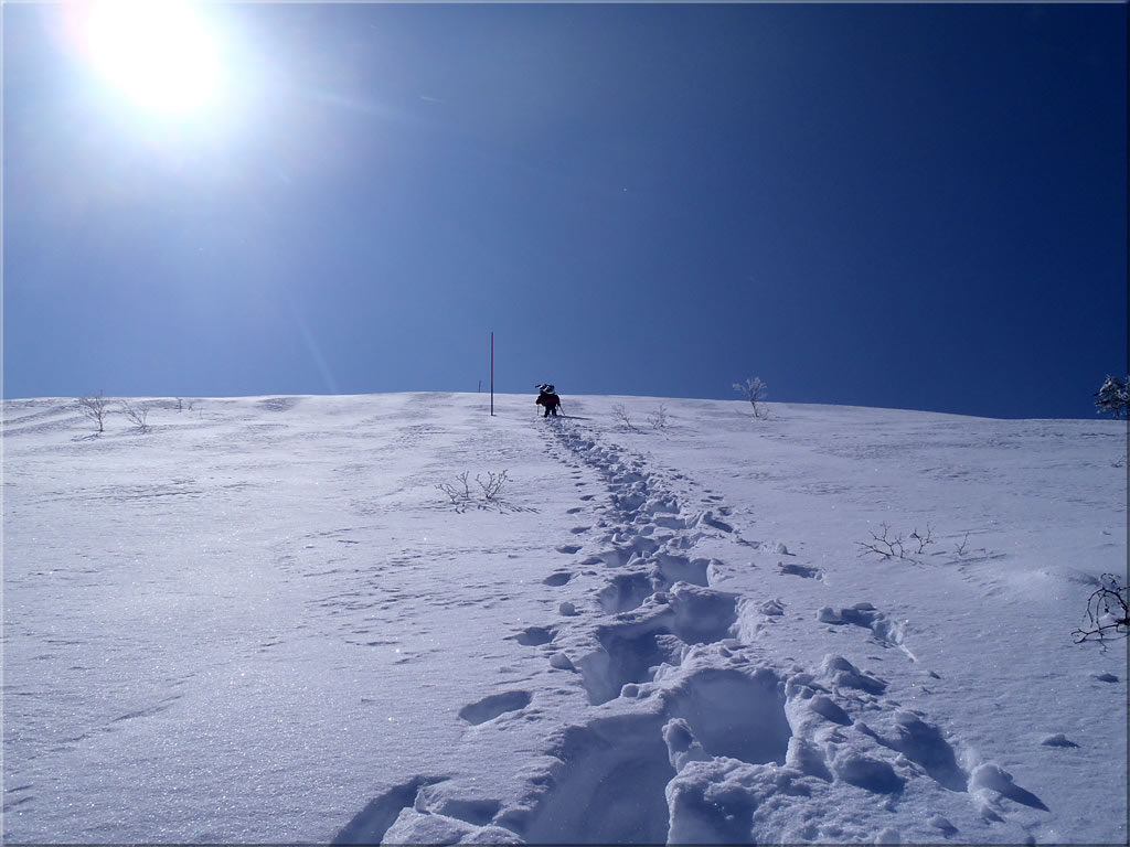 1月末に来た時は下地が無く、踏み抜いて大変でしたが、今回は先日の雨で堅い下地が出来、その上にさらさらの新雪が20〜30cmほど積もっています。帰りも問題なく滑って下りて来れそうです。