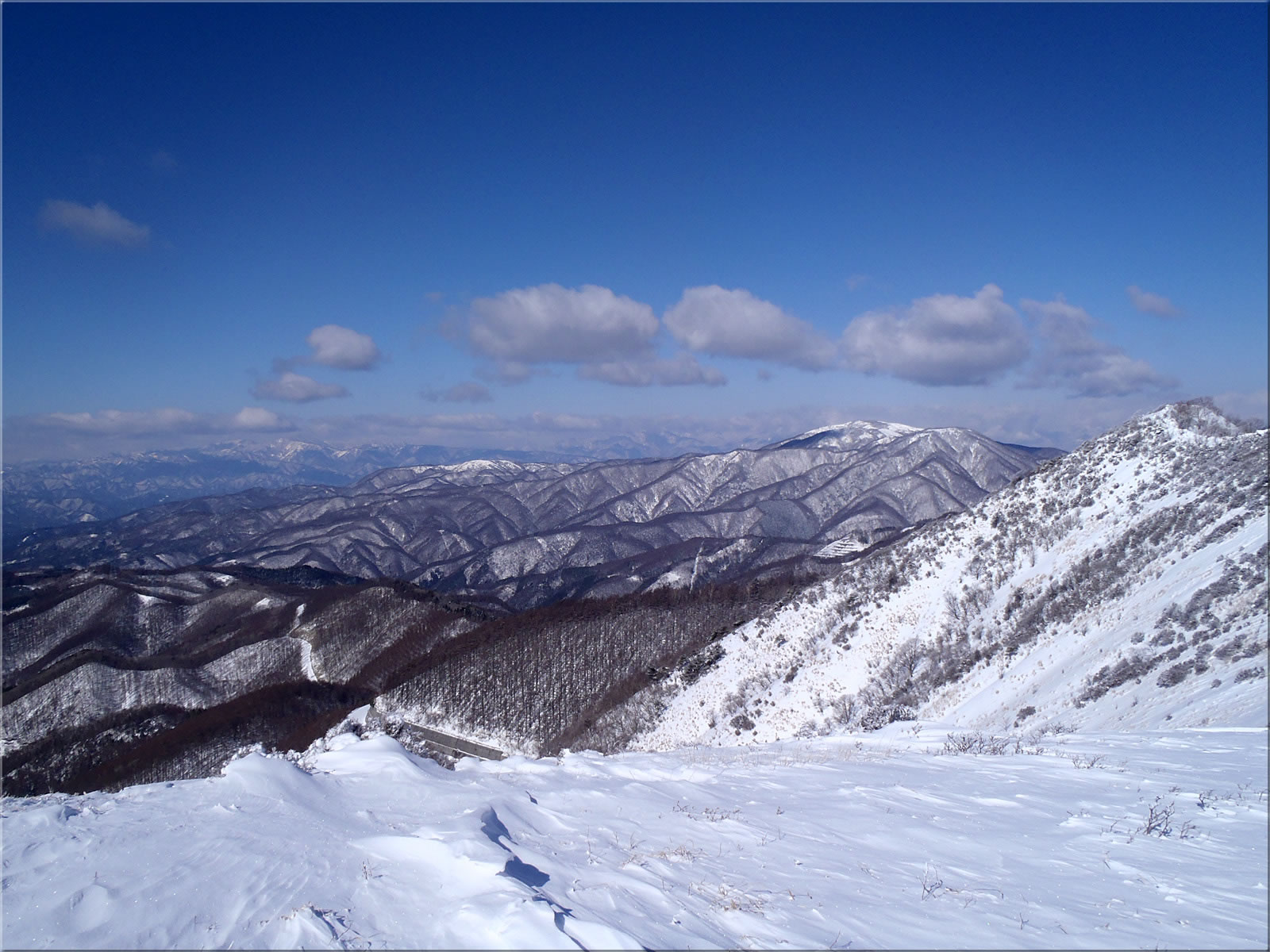 8時50分、最初のピークに到着。稜線の左側に1mほどの雪庇が出来ています。今回の積雪ですが、吹きだまったところはさらさらの新雪が30〜40cmも積もっていましたが、新雪が風で吹き飛ばされてしまった部分は雪が薄くブッシュが顔を出していました。