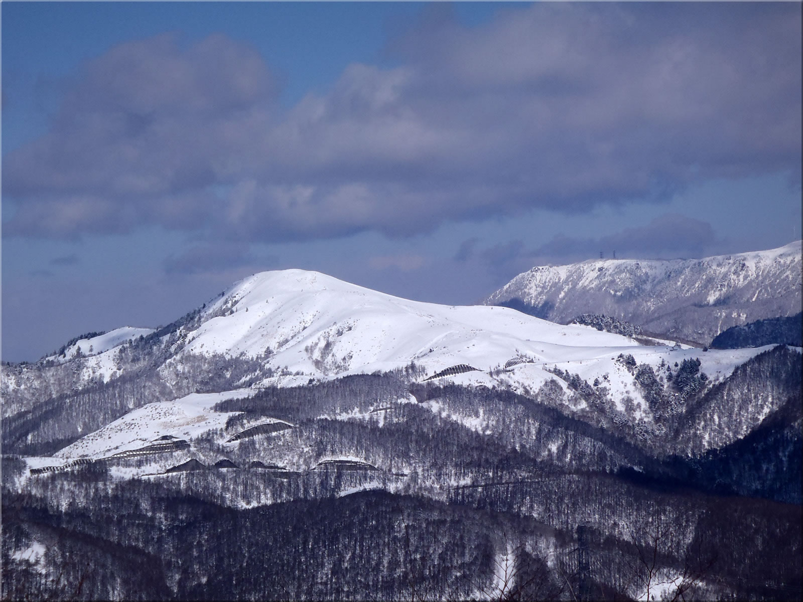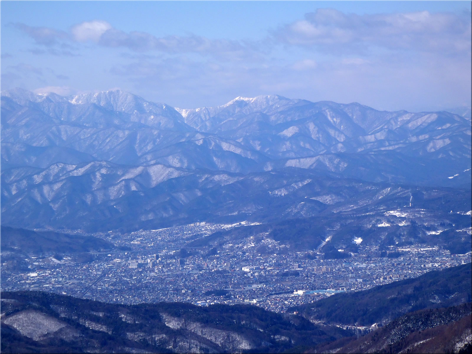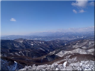 八ヶ岳赤岳、そして手前の車山をズーム。車山北面から沢渡スキー場跡の斜面にも雪がたっぷりと積もっているのが見えます(^^)。