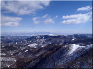 これから進む方向。その向こうには美ヶ原。後で滑る予定の右側斜面の雪も問題無さそうです。