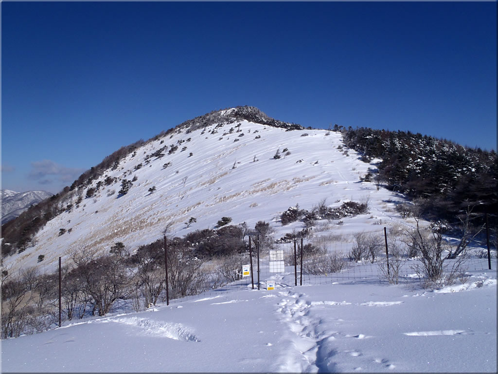 最初のピークに登る斜面ですが、登山道上にはさらさらの新雪が吹きだまっていました。ただし今日のこの暑い日射しで、おそらく明日にはクラストしてしまうと思われます。