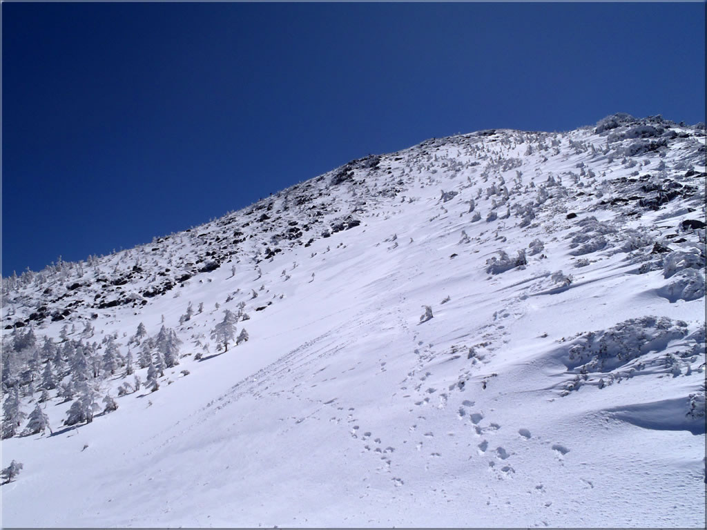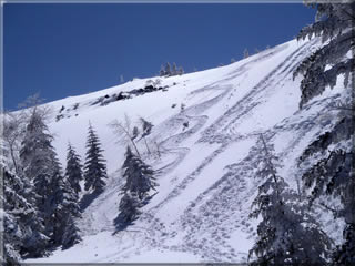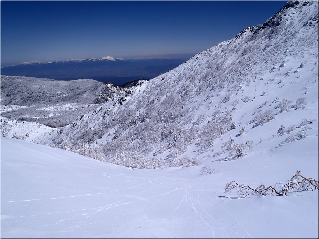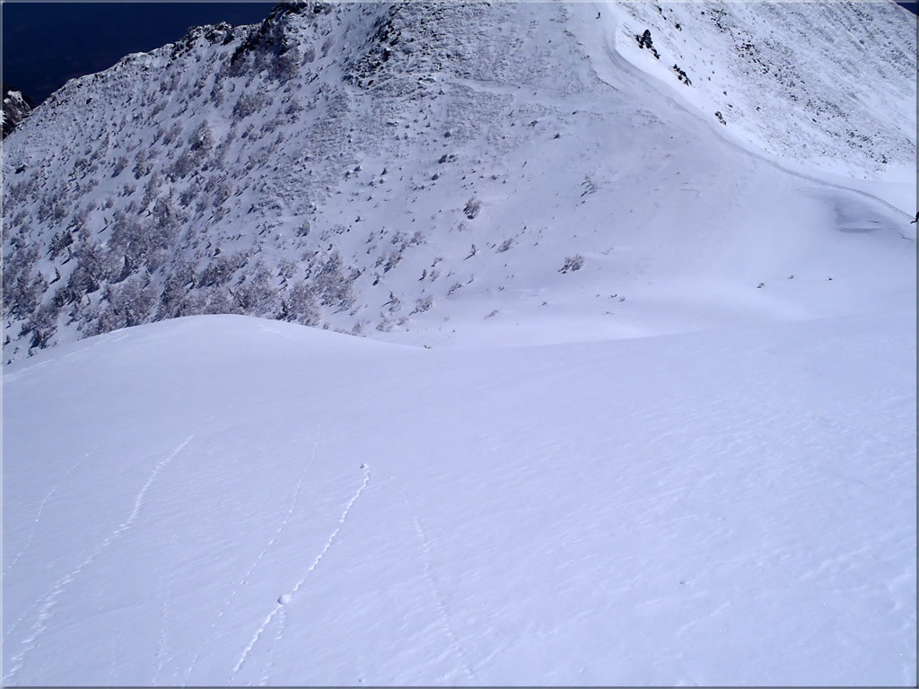 先ほどプチ滑落した(^^; 斜面をズーム。まともに滑れたのは最後の数ターンだけでした。雪が多い時は一番上の稜線辺りから滑り降りることが出来るのですが。