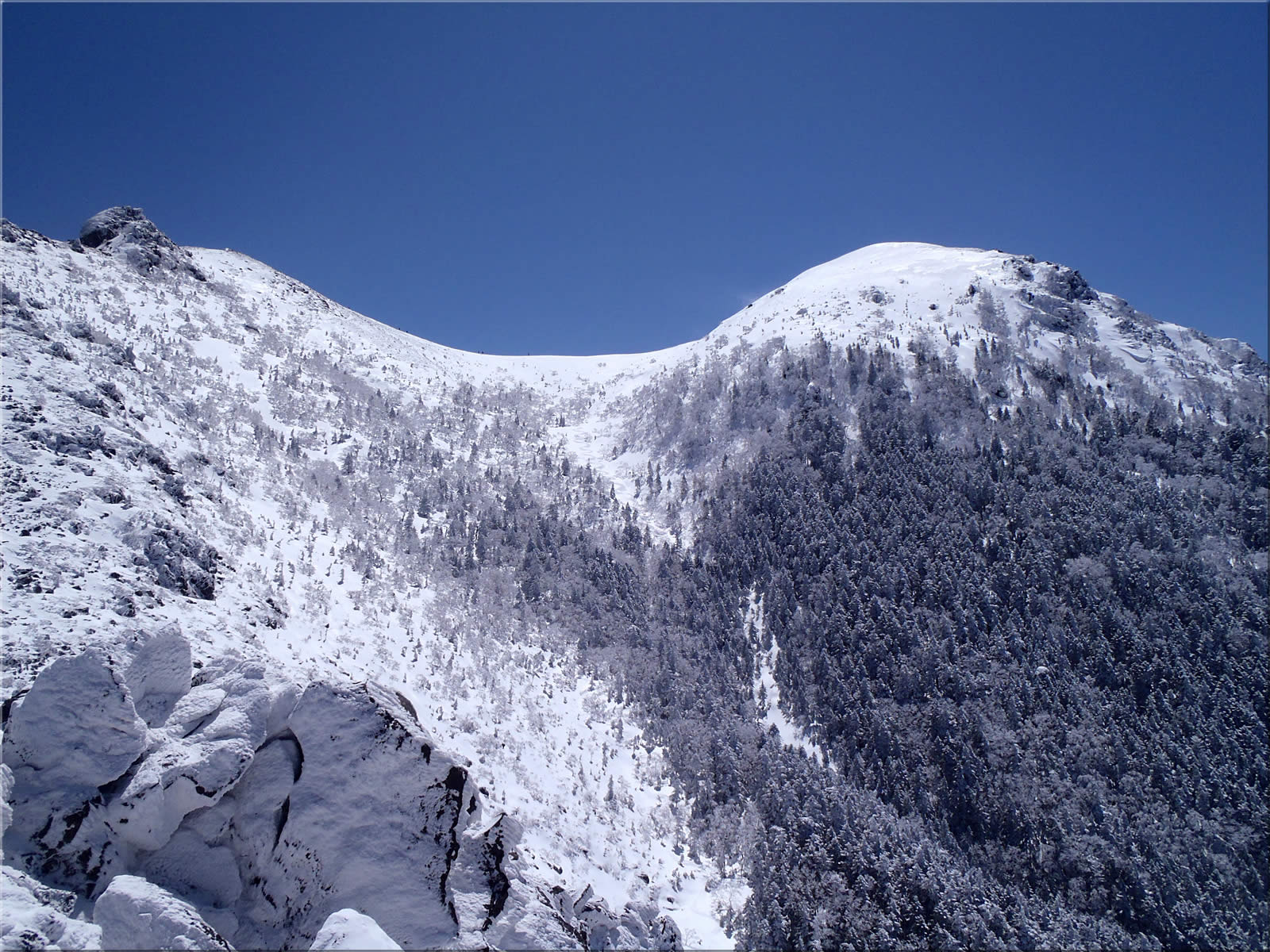 稜線上は新雪が吹き飛ばされて、アイゼンの爪の跡しか残らないかりかりのアイスバーンが続きました。一歩一歩慎重に登っていきます。