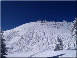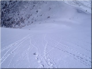 ではこの斜面を一応スキーで滑ってみることにします。登ってくるルートも、アイスバーン、もなか、ハードパック新雪という感じで滑るにはいまいちな雪質でしたので、ほぼ横滑りで注意しつつ降りていきます。もちろんシュプールもほとんど残りません。