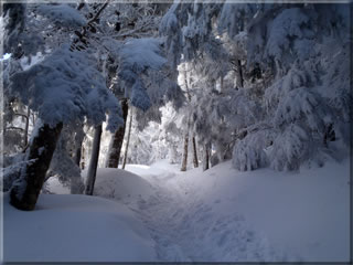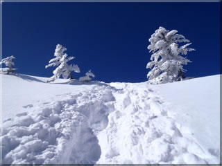この辺りで新雪は5〜10cmほどという感じでしょうか。周りの真っ白な木々の様子と比べると少し少なめです。西天狗の斜面には果たして吹きだまっているのでしょうか...。