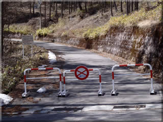 ここから上に上がる林道は冬期閉鎖が解除されていなくて、通行止めのゲートが置かれていました。もしかして上まで車で上がれたらラッキーと期待していたのですが、残念です(^^;。ではここから登山道を歩いて登ります。
