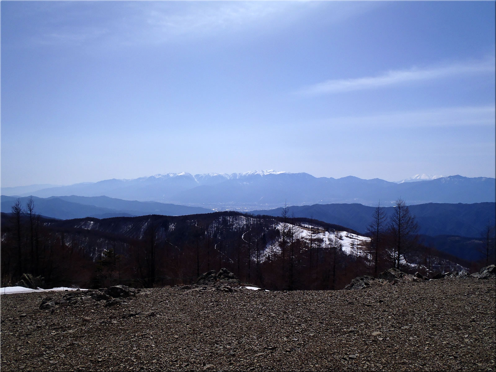 14時11分、入笠山山頂到着。もちろん他には誰もいませんで、山頂独り占めです。ただ...、この頃になるといつの間にか薄雲が広がってきてしまったのでした。今日は雲一つ無いクリアな快晴を楽しみに登ってきましたので、これは正直ショックでした(^^;。でも周囲の山々はクリアに見えていました。