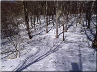 岩場コースとの分岐ですが、距離が短い岩場コースの方に少し進んでみましたが、最近の踏み跡が無く、雪が緩んで膝くらいまで沈んでしまいましたので、これはたまらないと慌てて岩場迂回コースの方に戻りました。岩場迂回コースの方は踏み跡がしっかりしていて、特に沈み込むことはなく快適に歩くことが出来ました。
