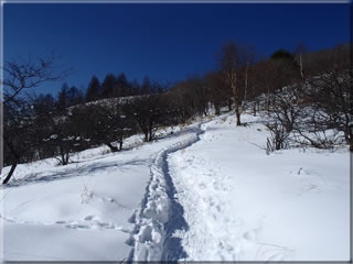 ここ数日降雪が無いこともあり、登山道はスノーシューでしっかりと踏み固められています。まあこれだけ踏み固められていれば坪足でもなんとか歩けないことはないでしょうが、トレースから一歩はずれるだけで膝以上に沈み込みますので、今の時期にこのルートを思う存分歩くにはスノーシューは必須だと思います。