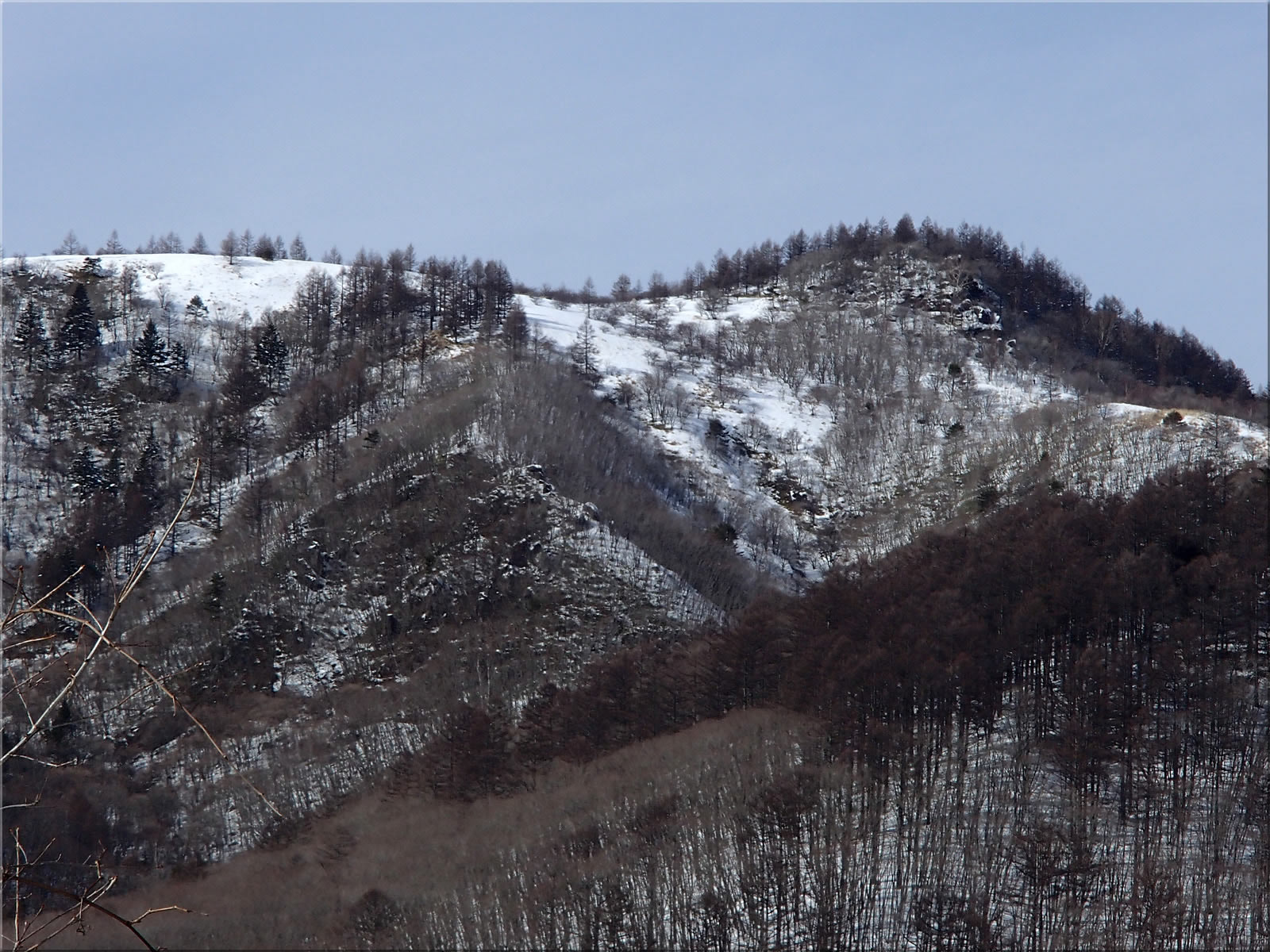 次の写真は家に帰る途中で先ほど滑った八子ヶ峰東斜面を振り返ったもの。写真中央にある目立つ尾根の右側の斜面を滑りましたが、私はさらに右よりの木が濃いラインを滑った感じです。中央の尾根に近い方を滑れば、比較的オープンバーンをかなり下まで滑ることが出来そうです。ま、それでも距離は大したことはありませんが。なおこの頃から一気に雲が広がってきました。