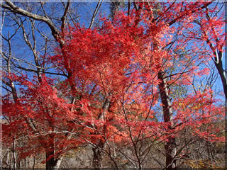 次の写真は旧御坂みちを下っている途中で見かけた紅葉です。下るに従って徐々にまだ見頃のもみじを見かけるようになります。