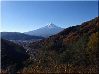 次の写真は河口湖の方に下り始めてすぐのところから撮影したもの。山の黄葉と富士山がきれいです。