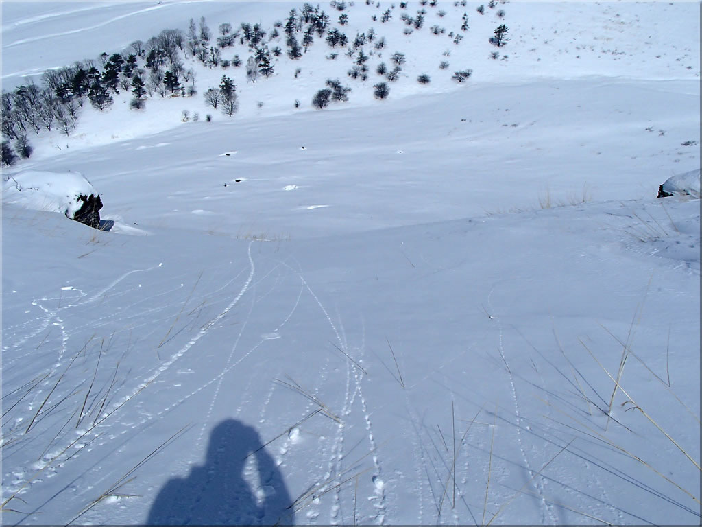 コルから北側に下っていく斜面も良さそうでしたので、続いてこの斜面を1本滑ってみることにします。