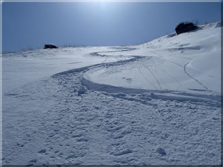 その先の斜面も、先ほど滑った斜面に比べると斜度がないせいか日射の影響をかなり受けていて、少し重めのパウダーになりつつありました。