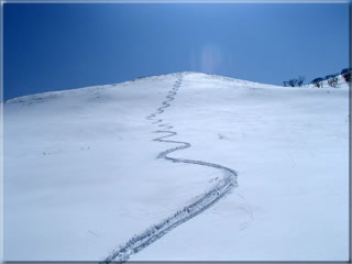 ここからの登り返しは自分のシュプールをたどって登っていきました。
