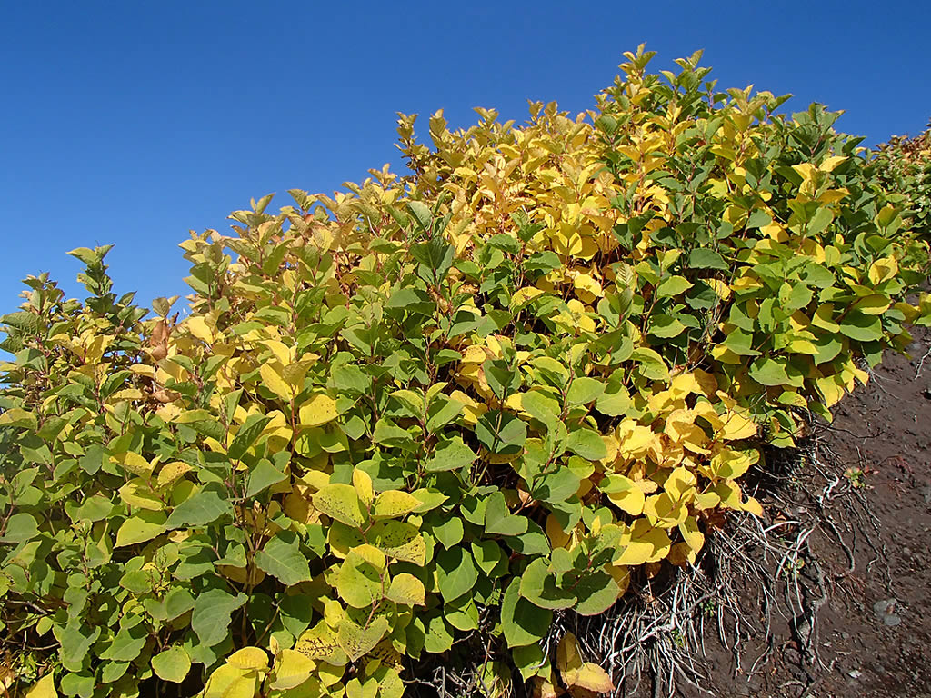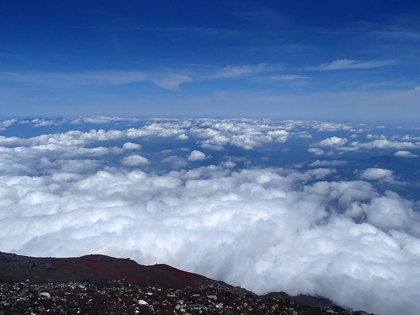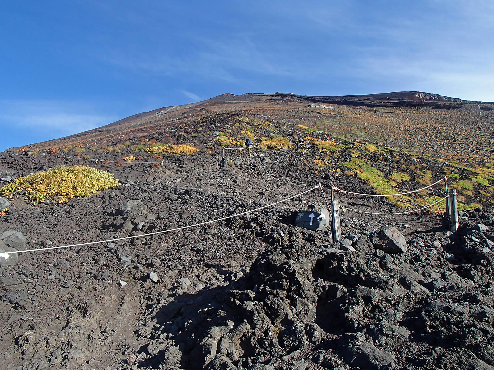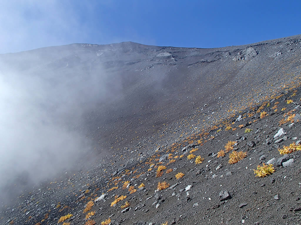 クリアな大展望を期待していましたが、残念ながら遠くはかすみ気味で、かつ早くからガスが湧いて雲海が広がってしまいましたが、でも5合目から上は雲一つ無い快晴となり、常に青空を見上げながらの気持ちよい富士山登山を楽しむことが出来ました。また富士山の紅葉は全く期待していなかったのですが、五合目の上でオンダテの草紅葉がちょうど見頃になっていて、斜面を一面黄色に染める紅葉がとても見事で感動しました。