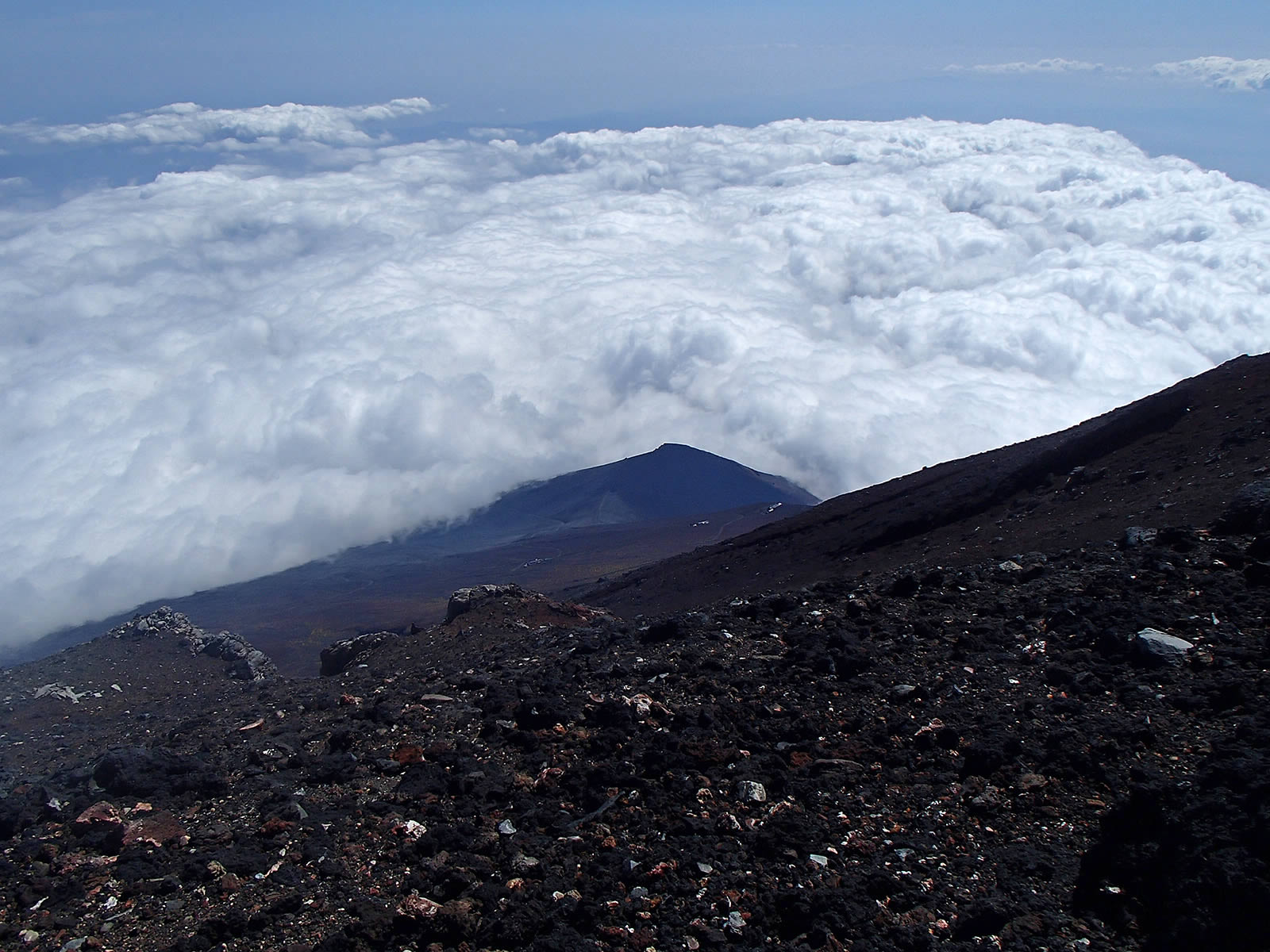 眼下に宝永山が見えてきました。なんとか雲海の上には出ているようです。