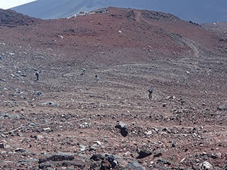 すぐにミニ砂走りと言っても良い、柔らかい砂が20cmほど溜まっているルートに出ます。軽快に下れますが、ただ小石も多いので、何となく登山靴を研磨しているような気分にもなります(^^;。ここはスパッツはあった方が良いでしょう。(私は面倒でしませんでしたが、靴の中に砂が結構入ってしまいます。)