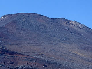山頂をズーム。途中になにやら白いものが少し見えます。残雪です。富士宮ルートではあそこだけに残雪が残っていました。