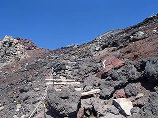 八合目の小屋手前には狭い岩場をよじ登るところもあります。夏場には渋滞が発生しやすいところですが、今日は登山者は行列になるほど多くありませんので大丈夫です。