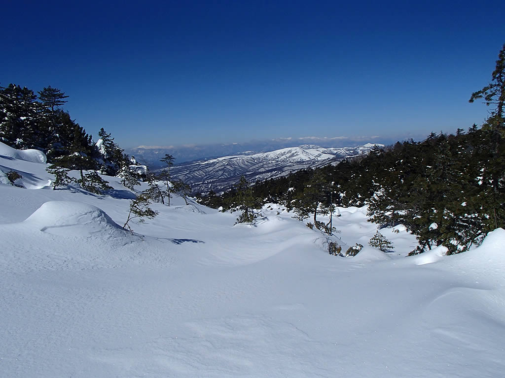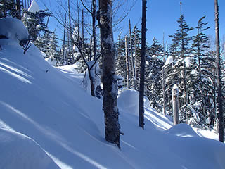 食事後、登山道を引き返して、12時10分、北側の急斜面の上部からスキーで樹林帯を滑り降りてみます。