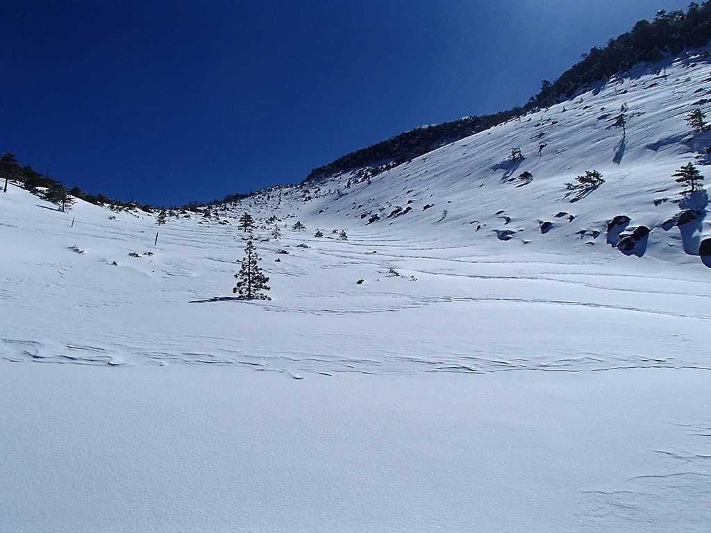 この斜面は東面で周囲を樹林で囲まれていますので、昨日の風の影響はそれほど無いのではと期待していたのですが、残念ながらこの斜面もクラスト気味でさらさらパウダーはありませんでした。
