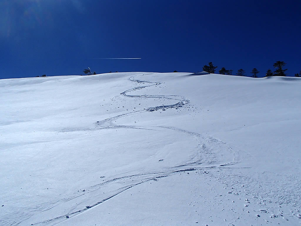 シュプールをズーム。この斜面の滑りで足がぱんぱんになってしまいました(^^;。