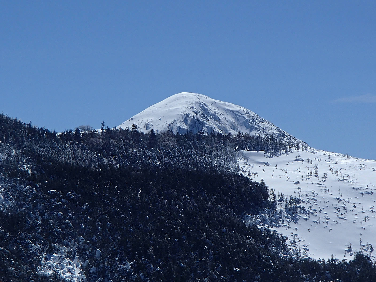 その斜面をズーム。標高差は70〜80mほどでしょうか。今回雪の状態が良ければ一度滑ってみようと思っていたのですが、残念ながらこの辺りの雪はかちかちでしたので諦めました。