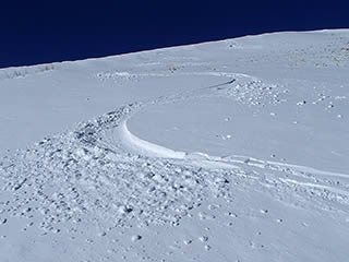 三峰山には東側に3つの斜面があるのですが、真ん中の斜面の様子を見ていきます。稜線直下はそれなりに雪が吹き溜まっていますね。