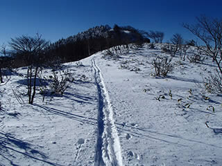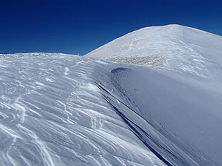 この辺は稜線上に雪庇が発達しているところもありますので、落ちないように注意して進みます。