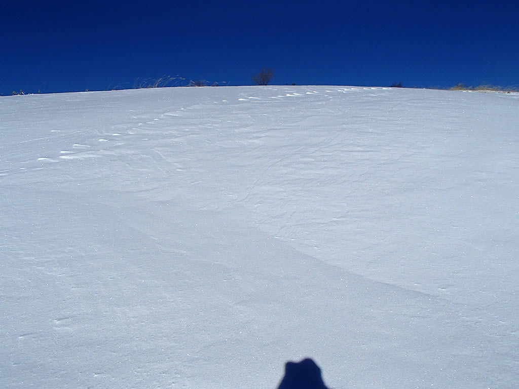 斜面の左側。この尾根上には雪が吹き溜まりやすいので、尾根上を途中まで滑り降りることもあります。