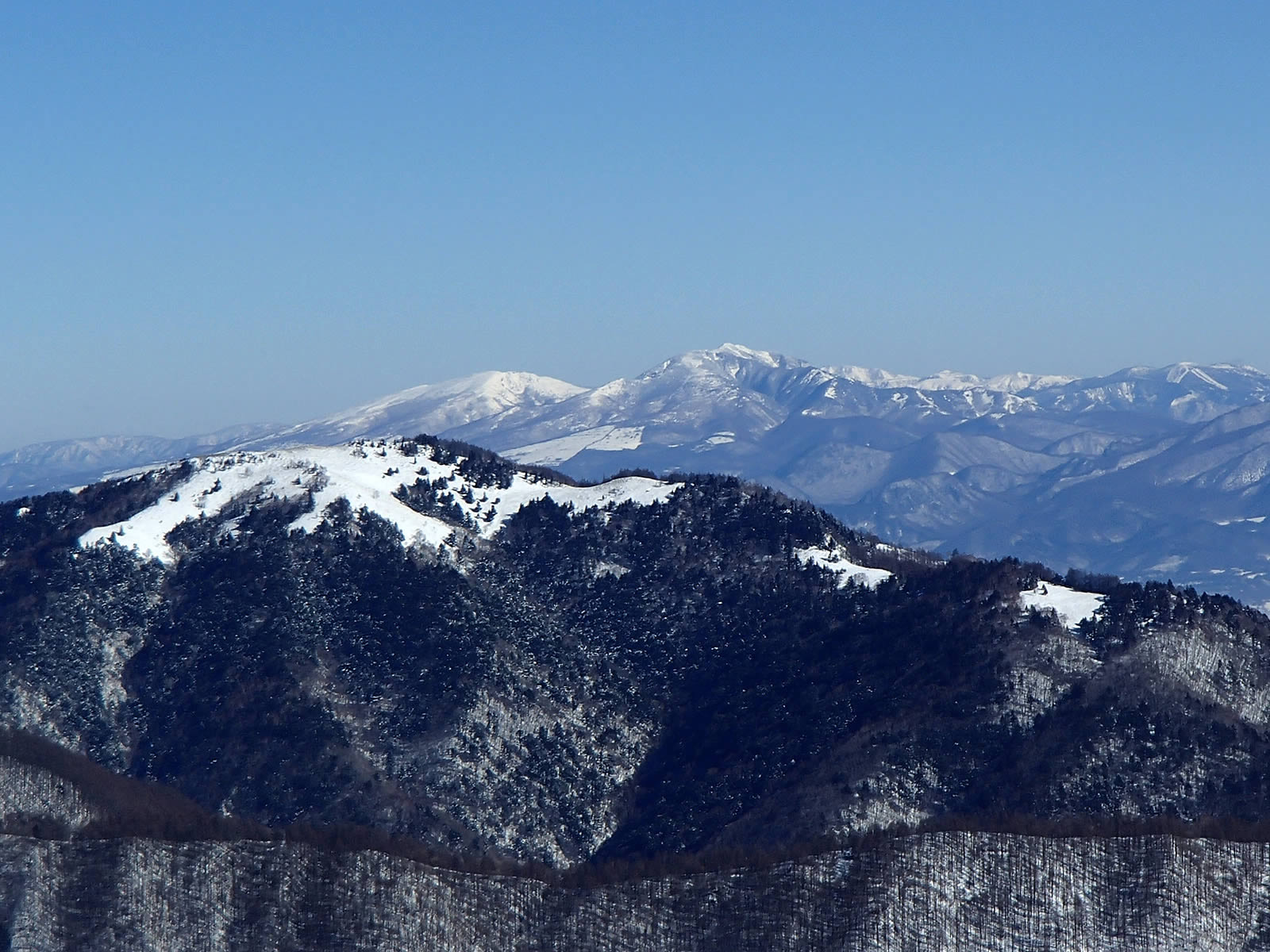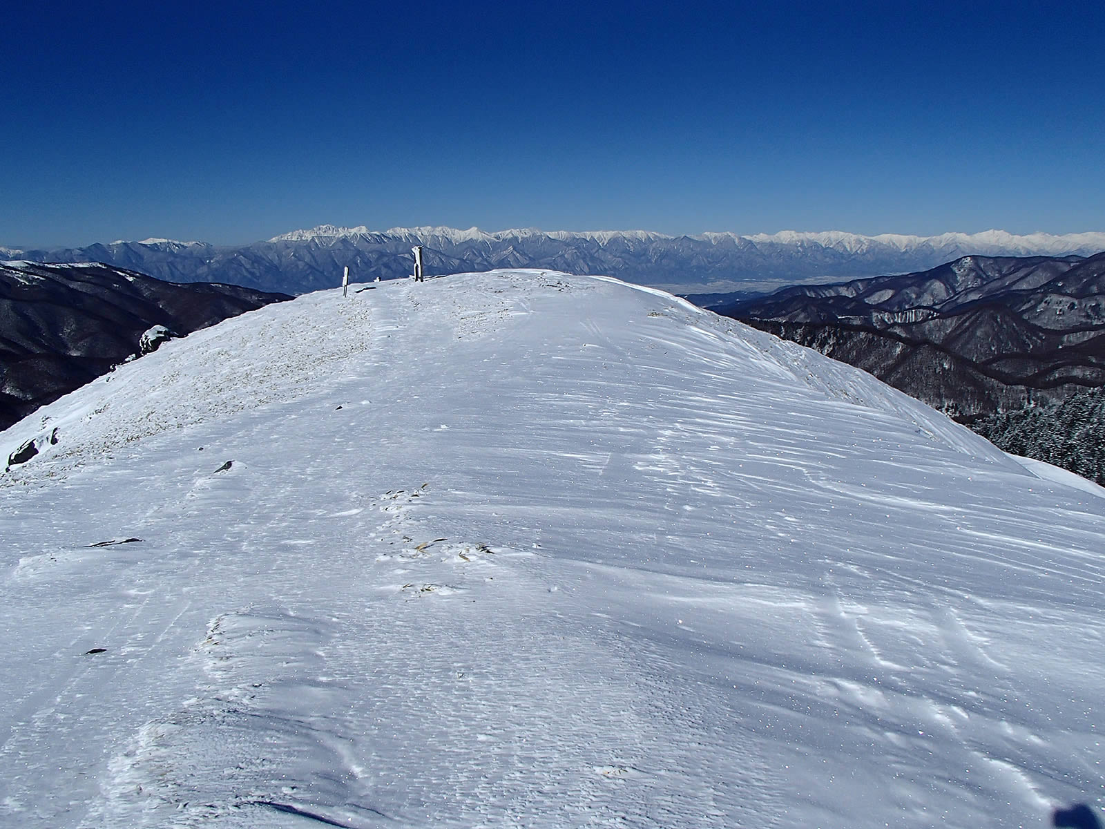 10時13分、三峰山山頂に到着。快晴ですが極寒の風が吹いていて、日差しがあっても全く暖かさを感じません(^^;。
