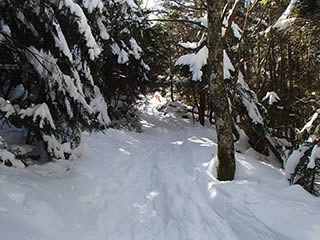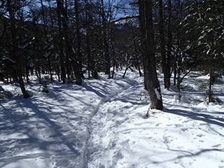 広い登山道の部分は今回もさらさらの雪がたっぷりと積もっています。帰りに滑るのが楽しみです。
