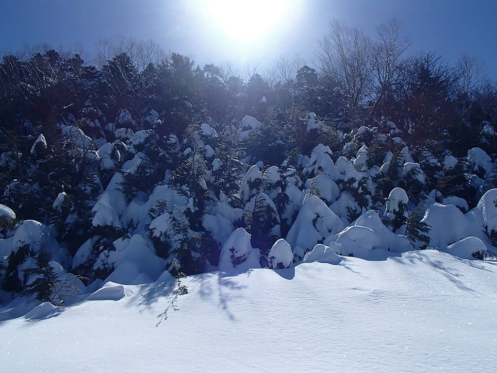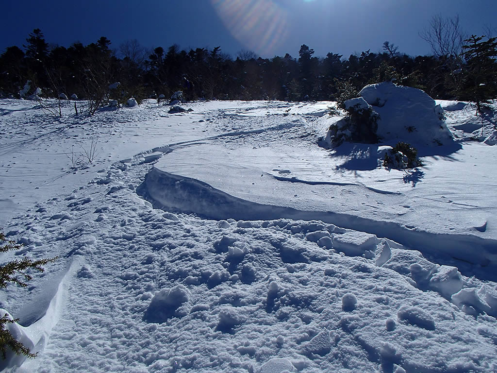 ただこの広い登山道の部分の日影の雪だけはパウダー感がまだ十分に残っていて楽しめました。