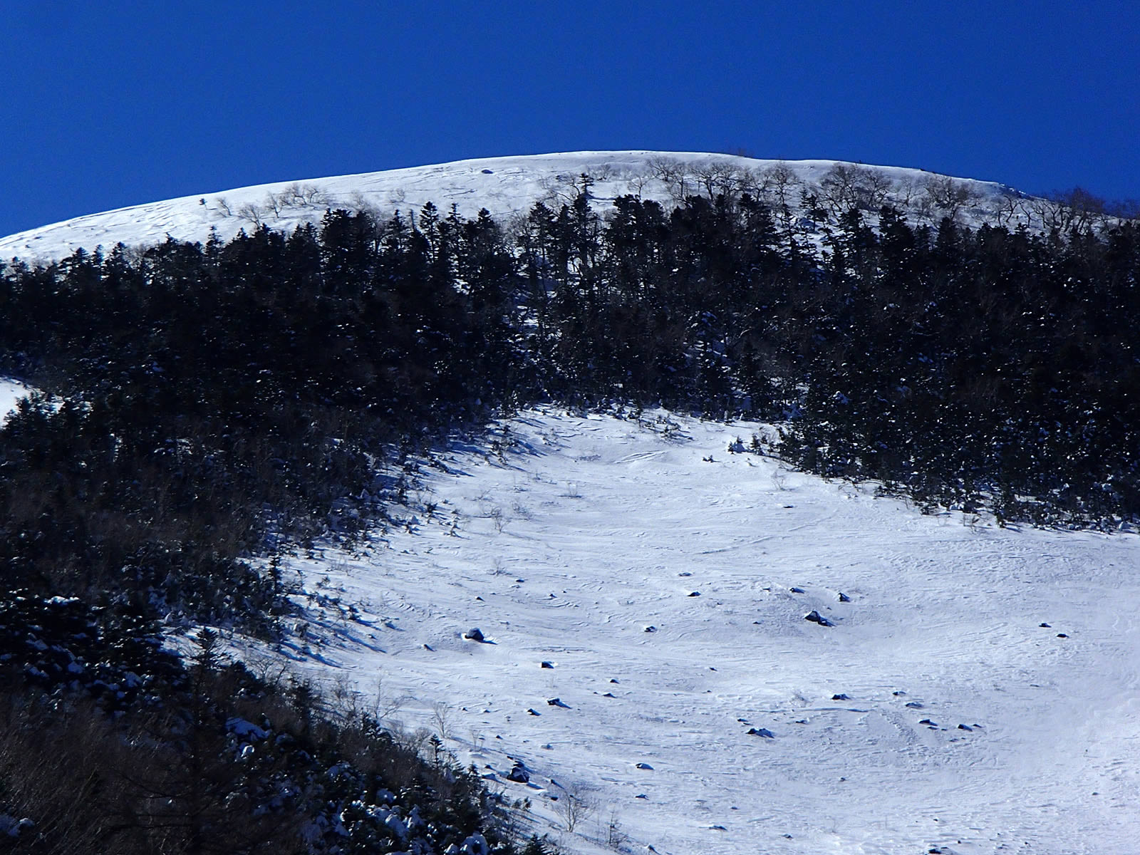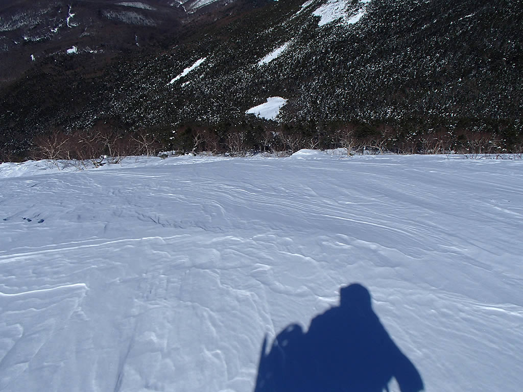 北面。さらさらパウダーはありそうにありませんが、ただパックされた新雪の部分はなんとか滑れそう。