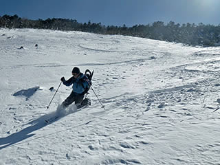 稜線直下のオープンバーンの上半分は、新雪が飛ばされてクラストバーンが出ている部分が目立ちました。