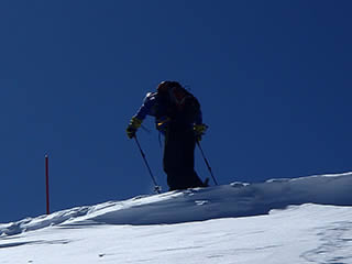 稜線直下のオープンバーンは直登せずにジグを切ってスキーで登っていきます。
